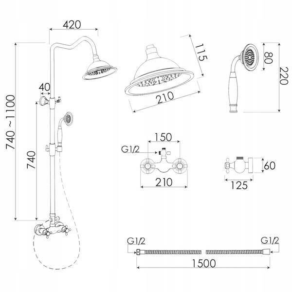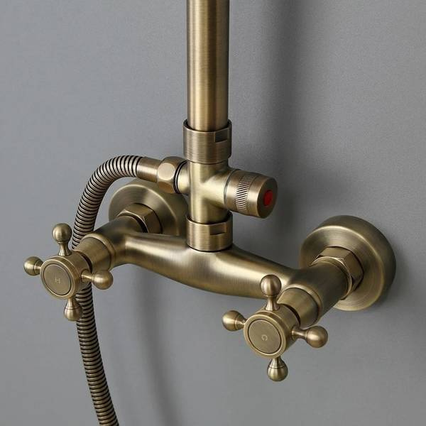Conjunto de ducha exterior en versión Premium que se caracteriza por la más alta calidad de fabricación. La grifería está hecha de latón y todo el conjunto está cubierto con un revestimiento protector en oro viejo. El cartucho cerámico garantiza un funcionamiento sin fallos durante mucho tiempo. La grifería con rociador está diseñada en estilo RETRO.