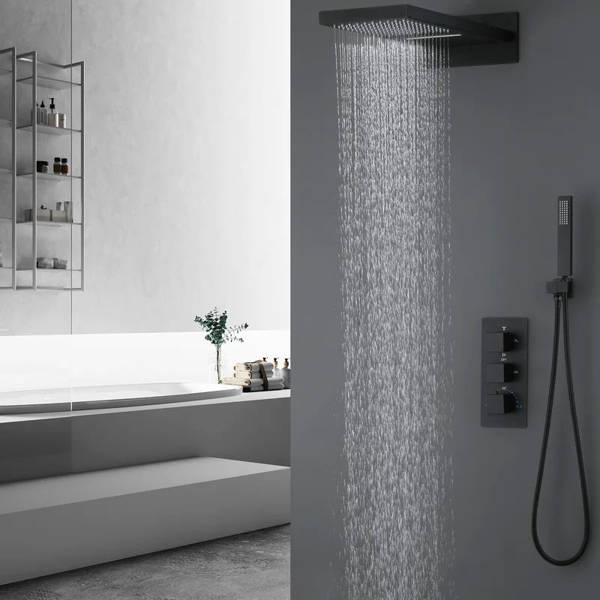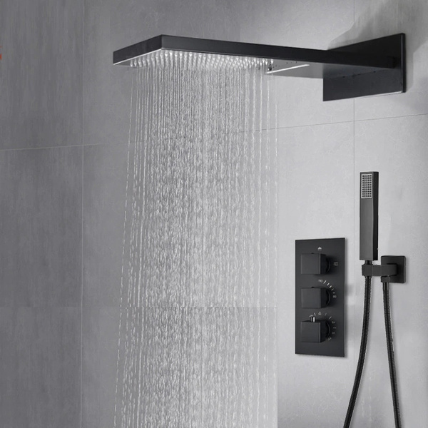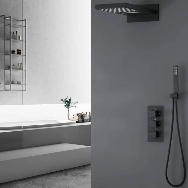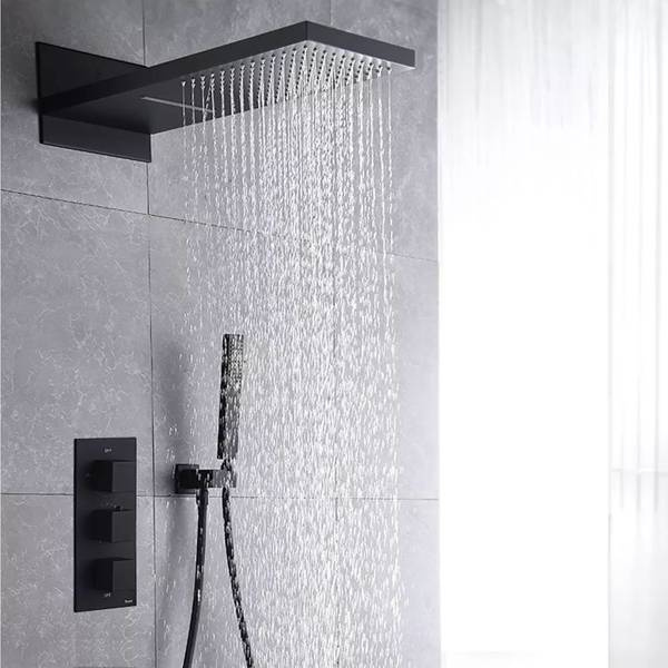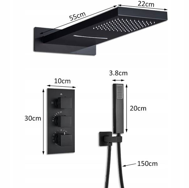 Conjunto de ducha empotrado en versión Premium, caracterizado por la más alta calidad de producción. La grifería está hecha de latón y todo el conjunto está cubierto con un acabado mate negro. El cartucho cerámico garantiza un funcionamiento sin fallos durante mucho tiempo. La grifería con rociador de lluvia está diseñada en un estilo moderno que evoca las últimas tendencias mundiales en decoración de interiores. Es una combinación perfecta de una forma elegante y estilizada con alta calidad de fabricación y simplicidad de uso.