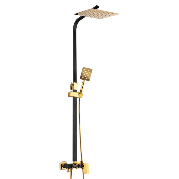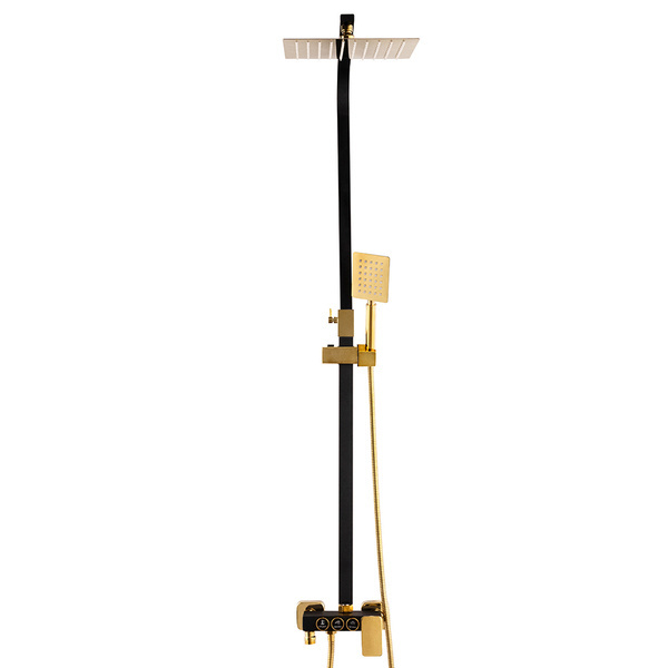 Conjunto de ducha exterior en versión Premium, caracterizado por la más alta calidad de fabricación. La grifería está hecha de latón, recubierta con un acabado mate negro y oro brillante. El cartucho cerámico garantiza un funcionamiento sin fallos durante mucho tiempo. La grifería con rociador de lluvia está diseñada en un estilo moderno.