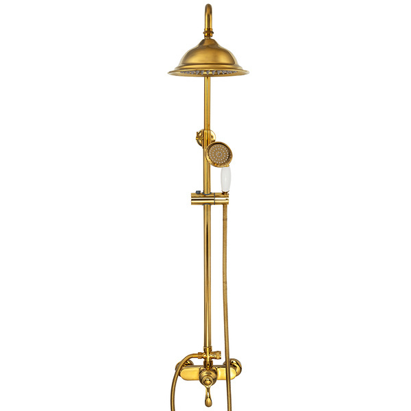Conjunto de ducha exterior en versión Premium, caracterizado por la más alta calidad de producción. La grifería está hecha de latón y todo el conjunto está recubierto con un brillante acabado dorado. El cartucho cerámico garantiza un funcionamiento sin fallos durante mucho tiempo. La grifería con rociador está diseñada en estilo RETRO.