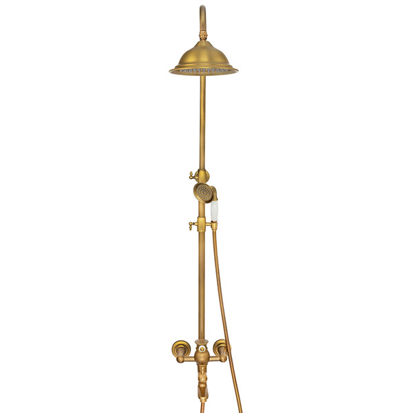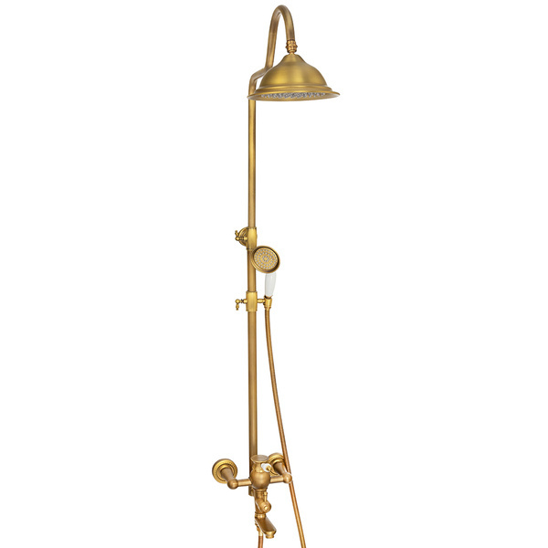Conjunto de ducha exterior en versión Premium que se caracteriza por la más alta calidad de producción. La grifería está hecha de latón y todo el conjunto está cubierto con un brillante revestimiento dorado. El cartucho cerámico garantiza un funcionamiento sin fallos durante mucho tiempo. La grifería con rociador está diseñada en estilo RETRO.