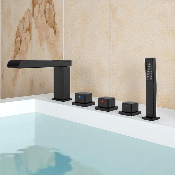 El grifo de bañera de 5 orificios en negro mate combina diseño moderno, funcionalidad y durabilidad. Su forma geométrica y minimalista en elegante negro resalta el carácter de los baños contemporáneos.