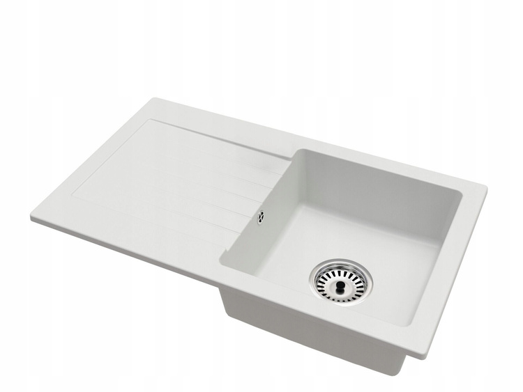 El fregadero de granito Leon en tono blanco puro es una opción ideal para interiores modernos, escandinavos o clásicos. El color claro combina perfectamente con muebles de madera, grises o de colores y aporta frescura y elegancia a la cocina. El fregadero de cocina Leon destaca por su funcionalidad: cuenta con una amplia zona de escurridor en el lado derecho y una práctica repisa con cuatro puntos para orificios de montaje (perforados a petición del cliente).