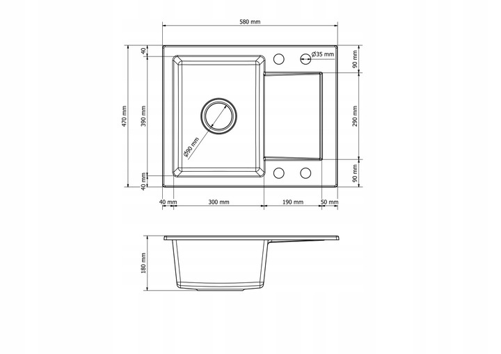 Medidas: 580 × 470 mm, cubeta 390 × 300 mm, profundidad 180 mm. Incluye sifón manual cromado de una cubeta con posibilidad de conexión a lavavajillas o lavadora.